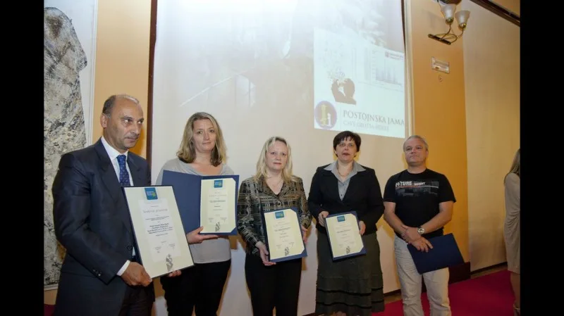 Marjan Batagelj, Tatjana Spetic, Vida Kolenc, and Sergeja Kariz from Postojnska jama d.d., together with Aljaz Mavric and Zoran Bistricski from Programski atelje A&Z d.o.o., Ljubljana, received the silver plaque for the innovation "Integrated, multi-functional, and multi-channel information platform DRAGON Venue Attraction Edition."