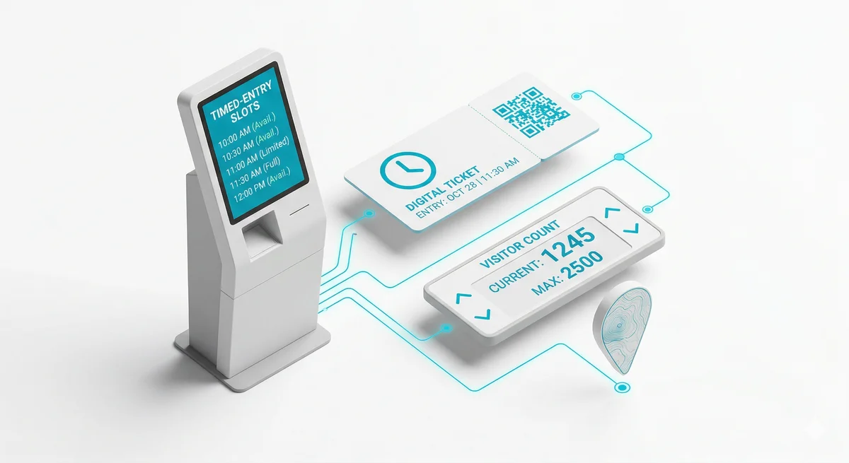 Upravljajte protokom posjetitelja s podesivim vremenskim prozorima i ograničenjima kapaciteta. Ekrani za kupce na blagajnama, integracija bankovnog terminala, API za informacijske displeje za posjetitelje.